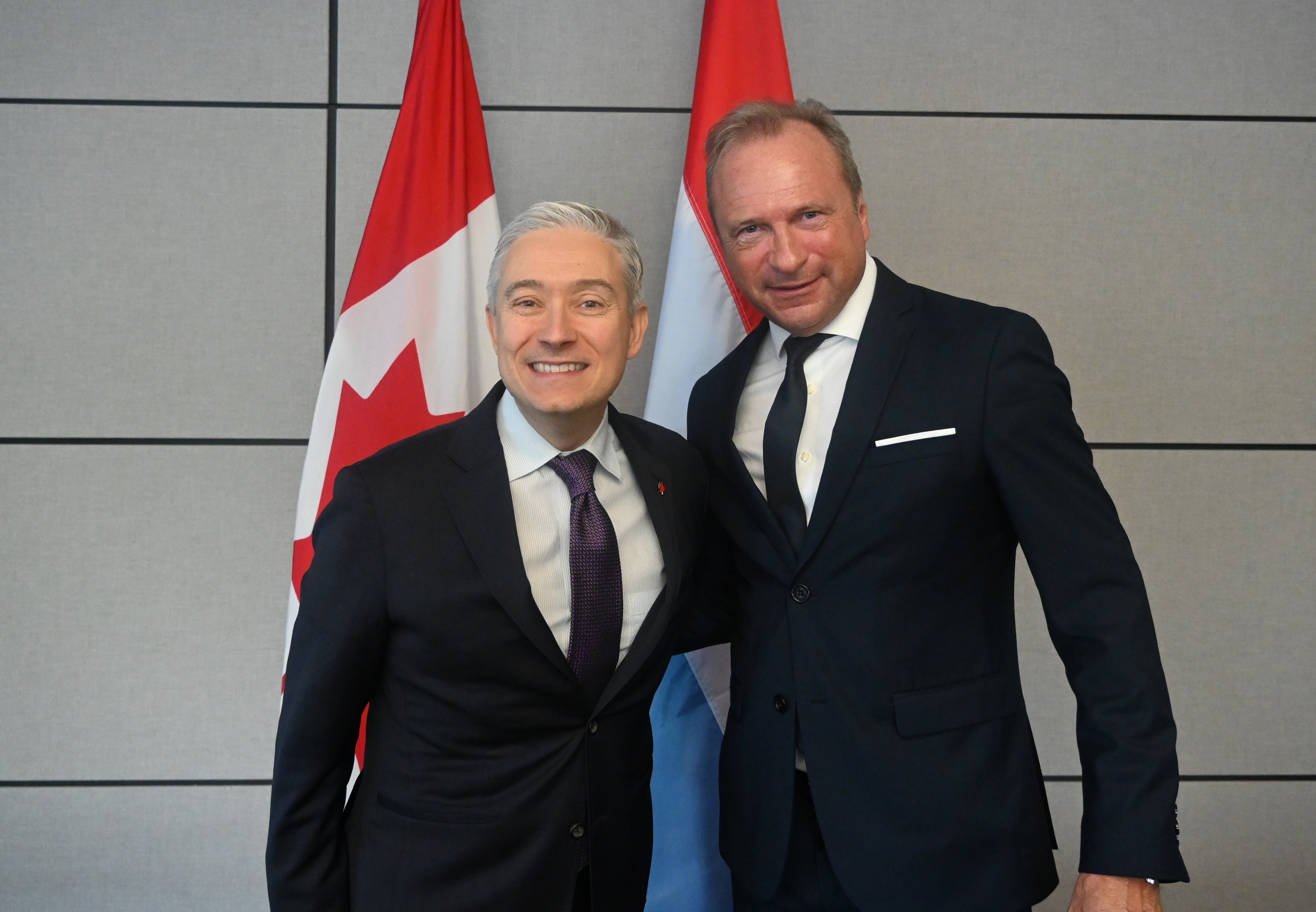 À Ottawa, le ministre Gilles Roth a rencontré François Philippe Champagne, ministre des Finances et du Revenu national du Canada, qui préside actuellement les réunions des ministres des Finances du G7, afin d'évoquer les priorités économiques et géopolitiques, l'intégration des marchés de capitaux et les opportunités d'investissement entre le Luxembourg et le Canada. Les deux ministres ont convenu de renforcer les relations bilatérales dans le domaine des services financiers, compte tenu du potentiel encore largement inexploité, à un moment où les deux pays doivent investir de manière significative dans des domaines stratégiques tels que la cybersécurité, la défense et la transition verte.